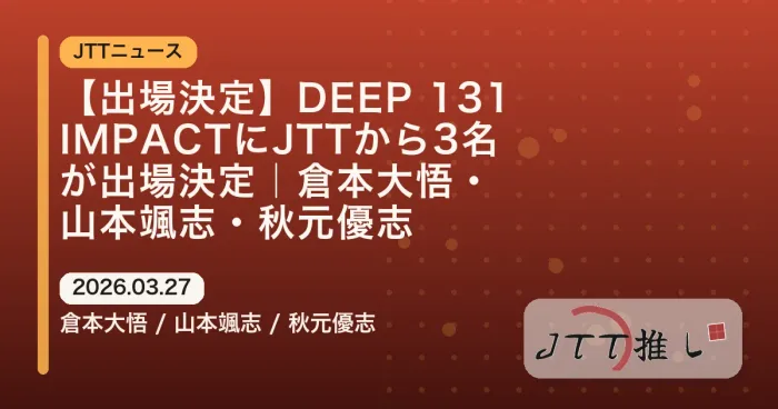 2026年5月4日開催のDEEP 131 IMPACTに、JAPAN TOP TEAMから倉本大悟、山本颯志、秋元優志の3名の出場が決定。倉本はライト級タイトルマッチで大原樹理と再戦、山本はPFL凱旋の泉武志と対戦、秋元はアマチュアSルールで連戦に臨む。